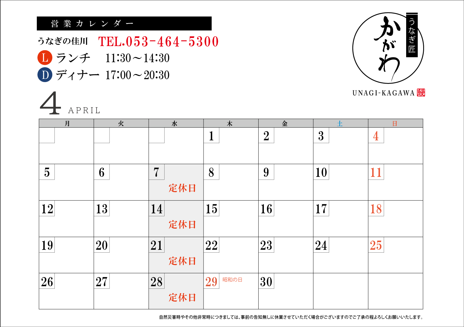 4月の営業日時につきましては、下記のチラシに詳細を掲載しております。