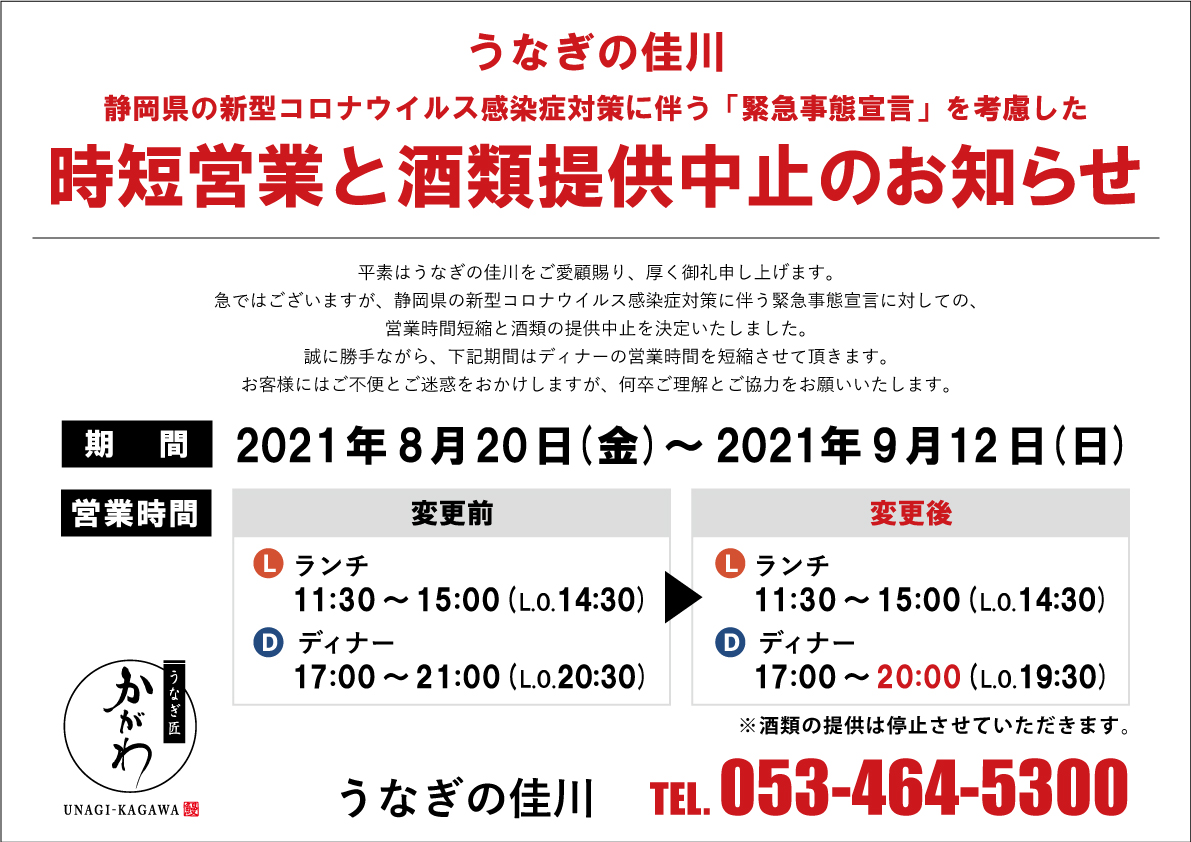 急ではございますが、静岡県の新型コロナウイルス感染症対策に伴う緊急事態宣言に対しての、営業時間短縮と酒類の提供中止を決定いたしました。