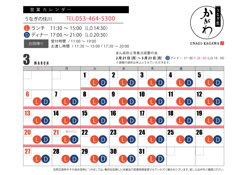 3月の営業日時につきましては、下記のチラシに詳細を掲載しております。