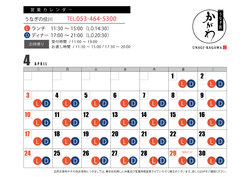 4月の営業日時につきましては、下記のチラシに詳細を掲載しております。