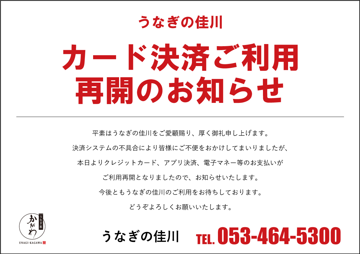 今後ともうなぎの佳川のご利用をお待ちしております。
