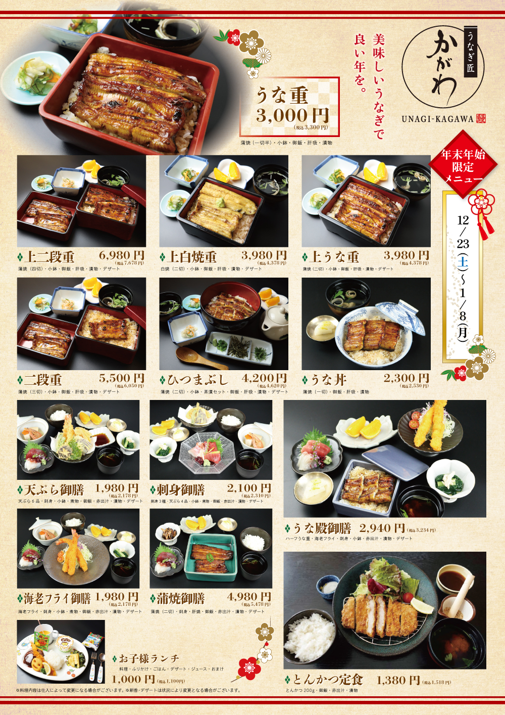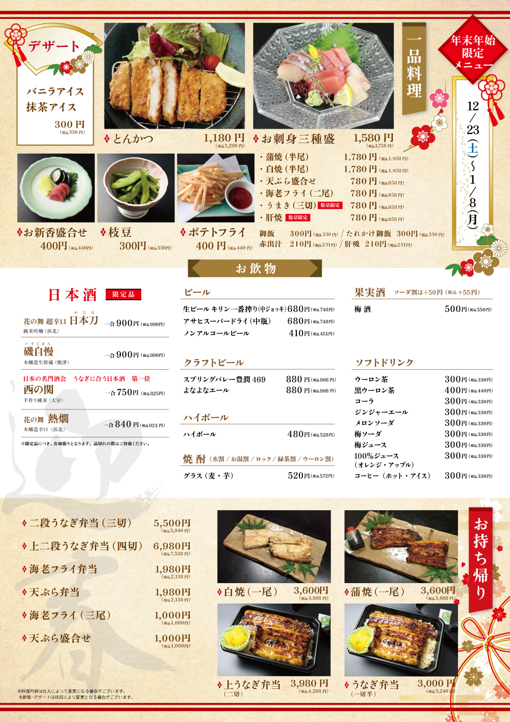 12月23日(土)~2024年1月8日(月)までの期間、年末年始限定メニューをご提供させていただきます。