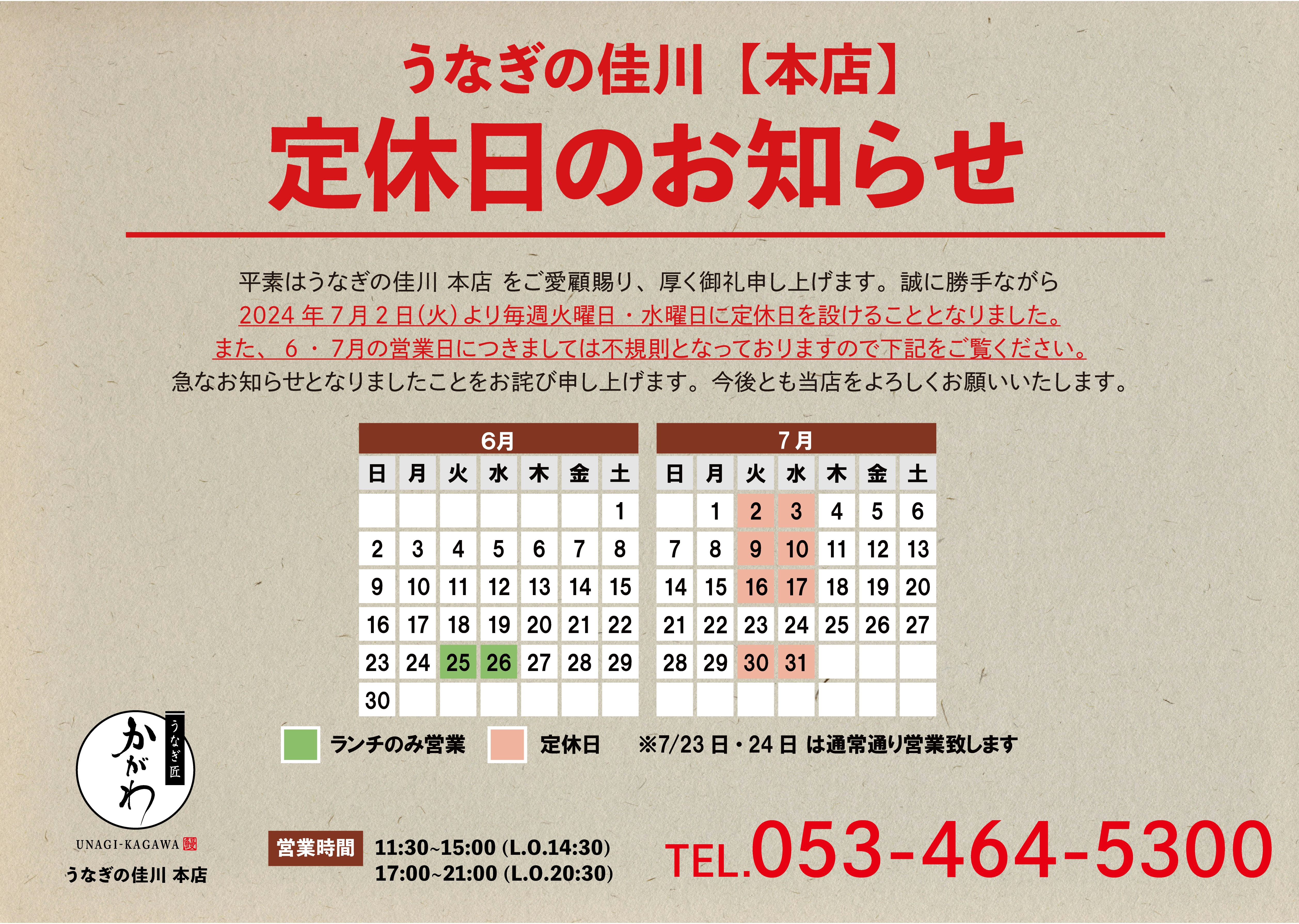 佳川本店におきまして、2024年7月2日より定休日を設けることとなりましたのでお知らせを致します。