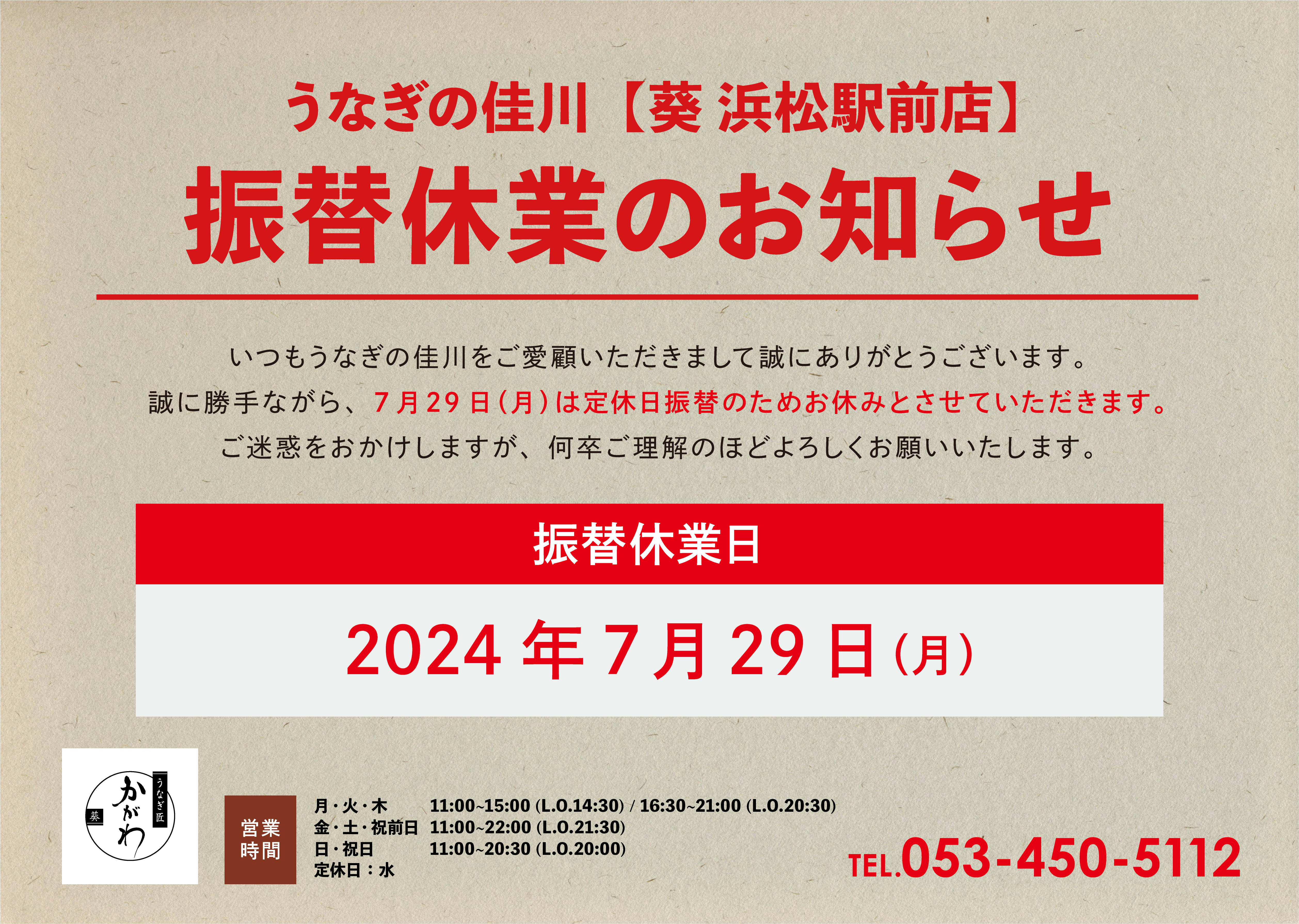 つきましては、誠に勝手ながら、7月29日(月)は定休日振替のため、お休みとさせて頂きます。