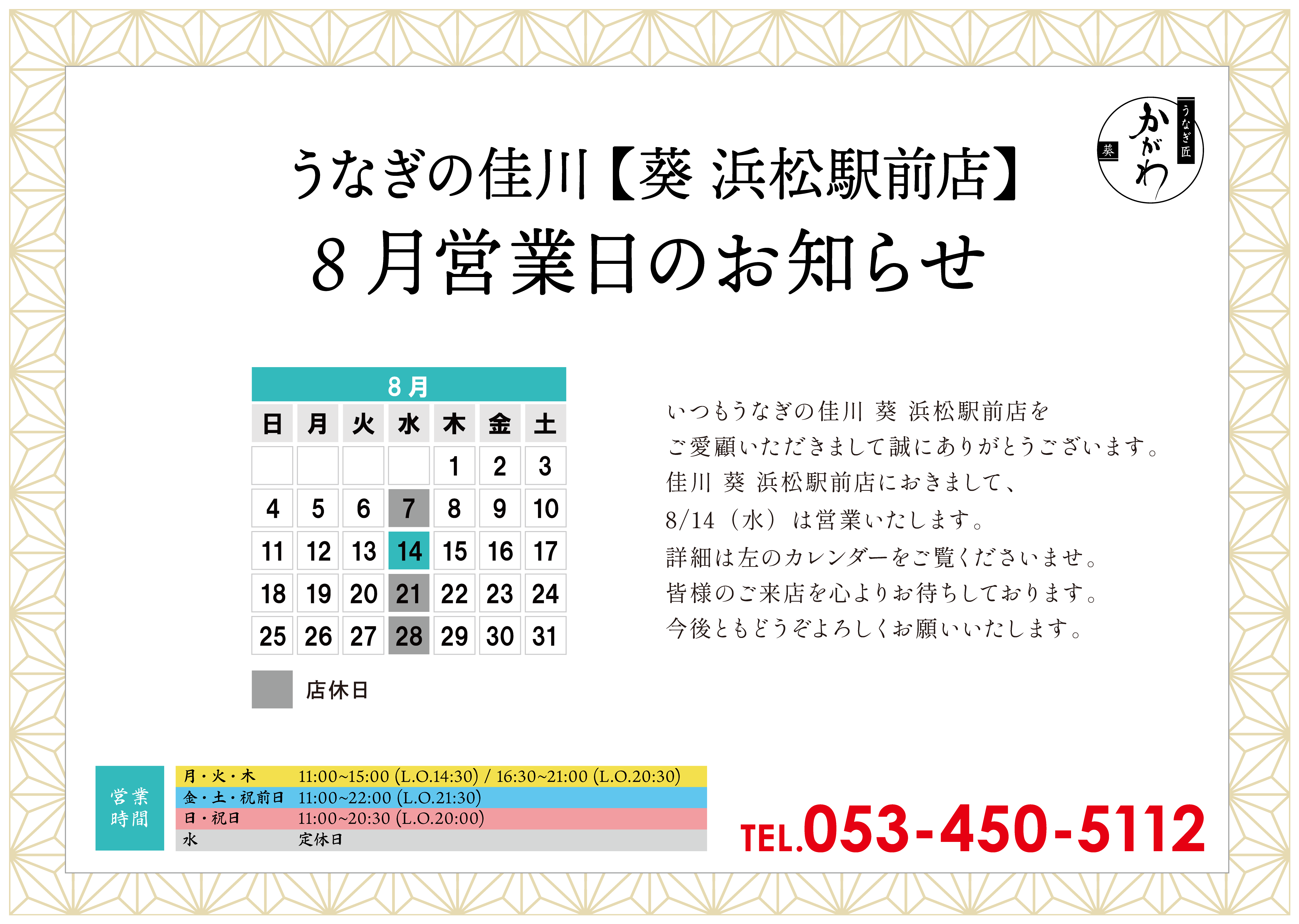 いつもうなぎの佳川 葵 浜松駅前店をご愛顧いただきまして誠にありがとうございます。