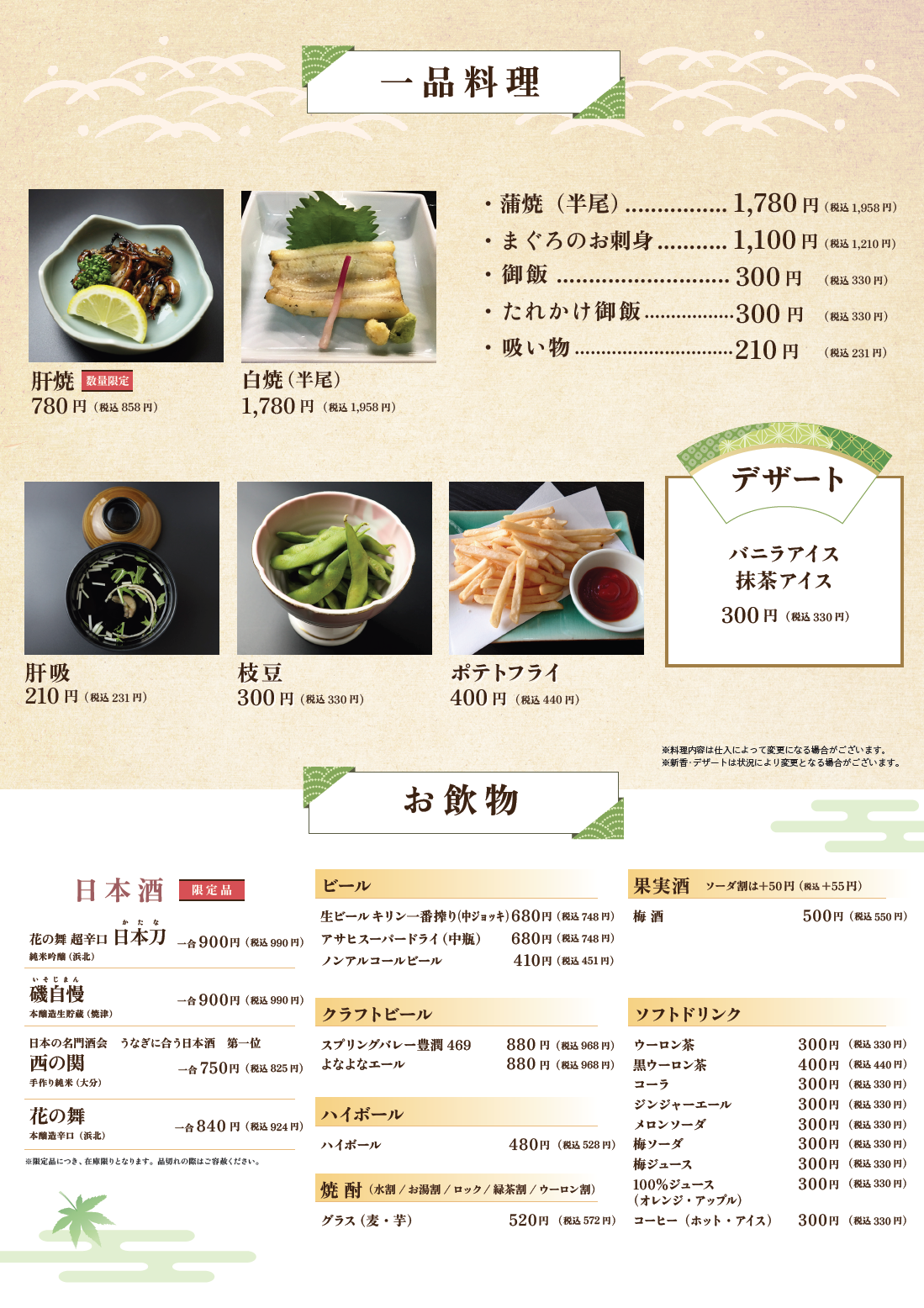 うなぎ限定メニューのお知らせ