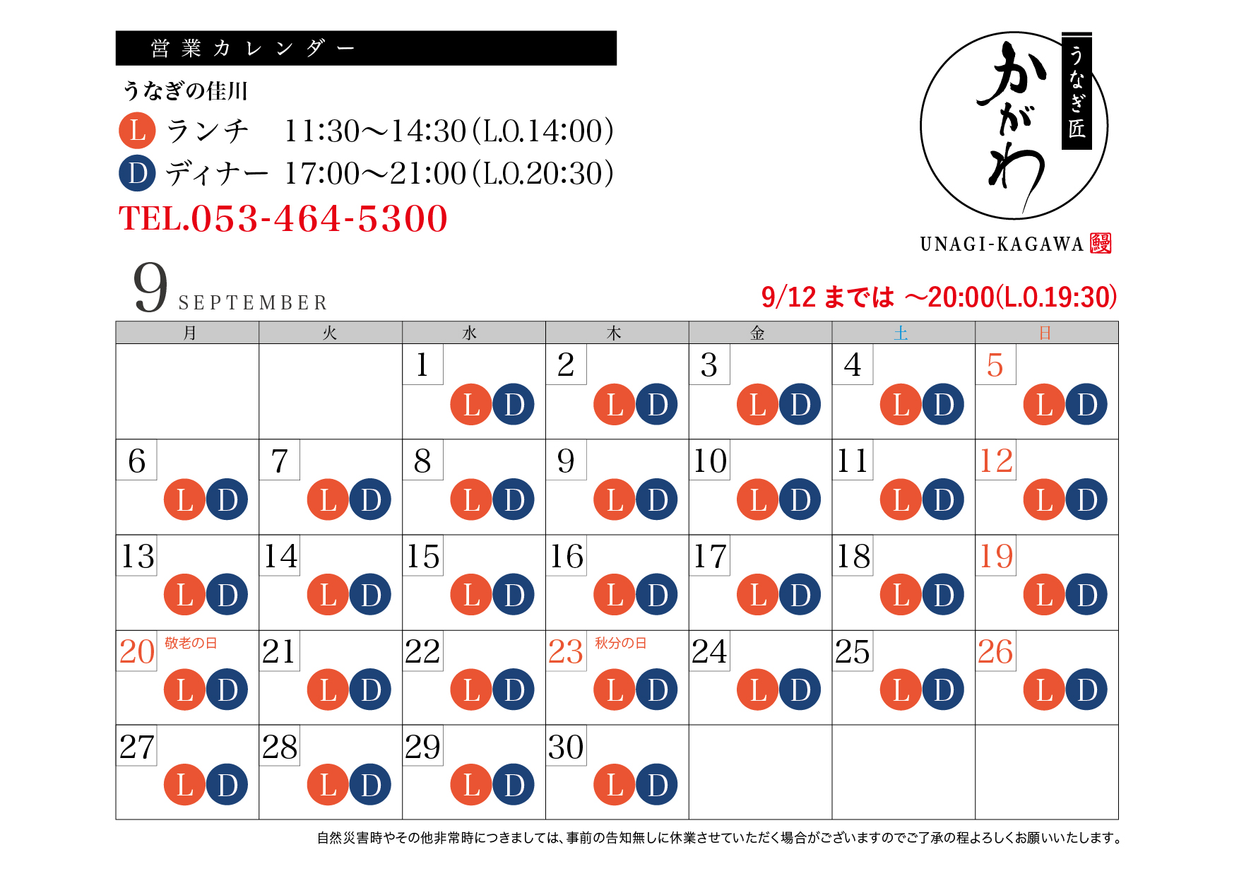 9月の営業日時につきましては、下記のチラシに詳細を掲載しております。