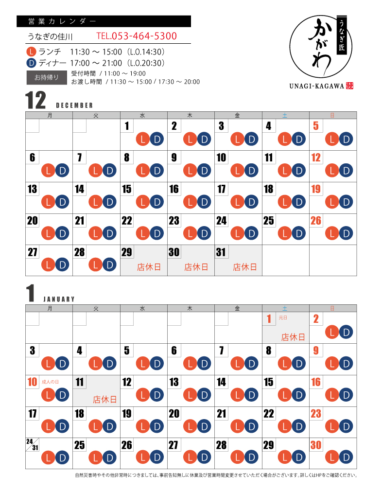12月と1月の営業日時につきましては、下記のチラシに詳細を掲載しております。