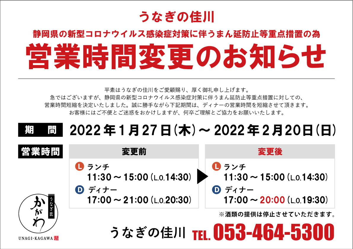 営業時間短縮と酒類の提供停止を決定いたしました。