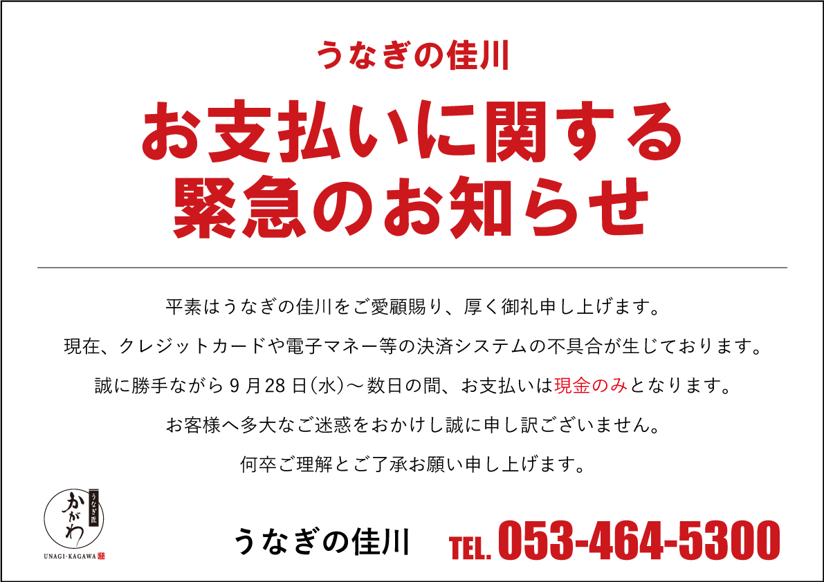 誠に勝手ながら9月28日(水)~数日の間、お支払いは「現金のみ」となります。