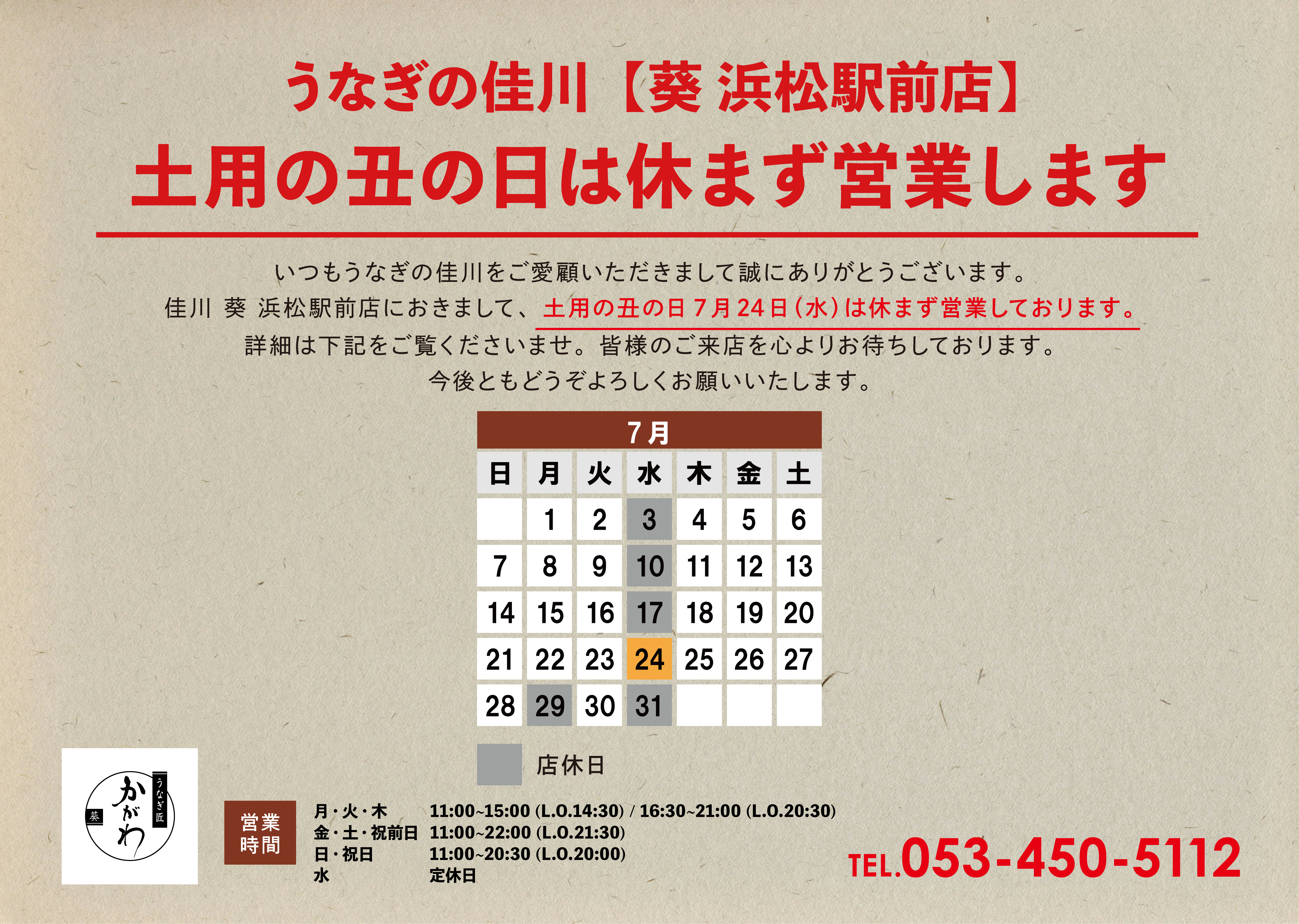 佳川 葵 浜松駅前店におきまして、土用の丑の日7月24日(水)は休まず営業しております。