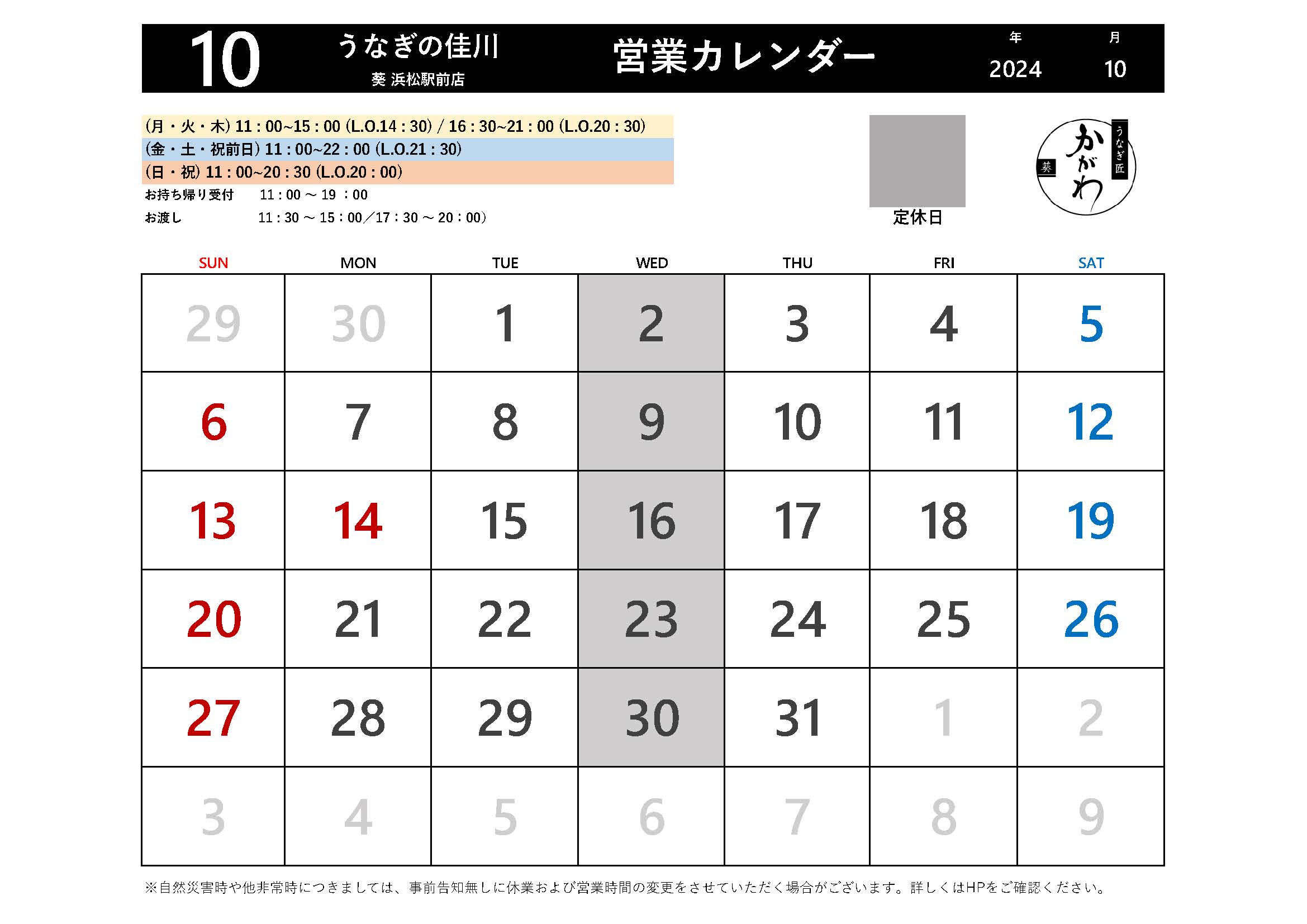 駅前店の10月は、下記カレンダーのとおり営業いたします。