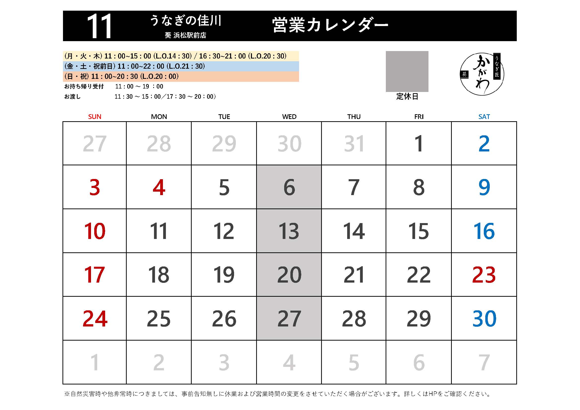 【葵店】11月営業日のお知らせ